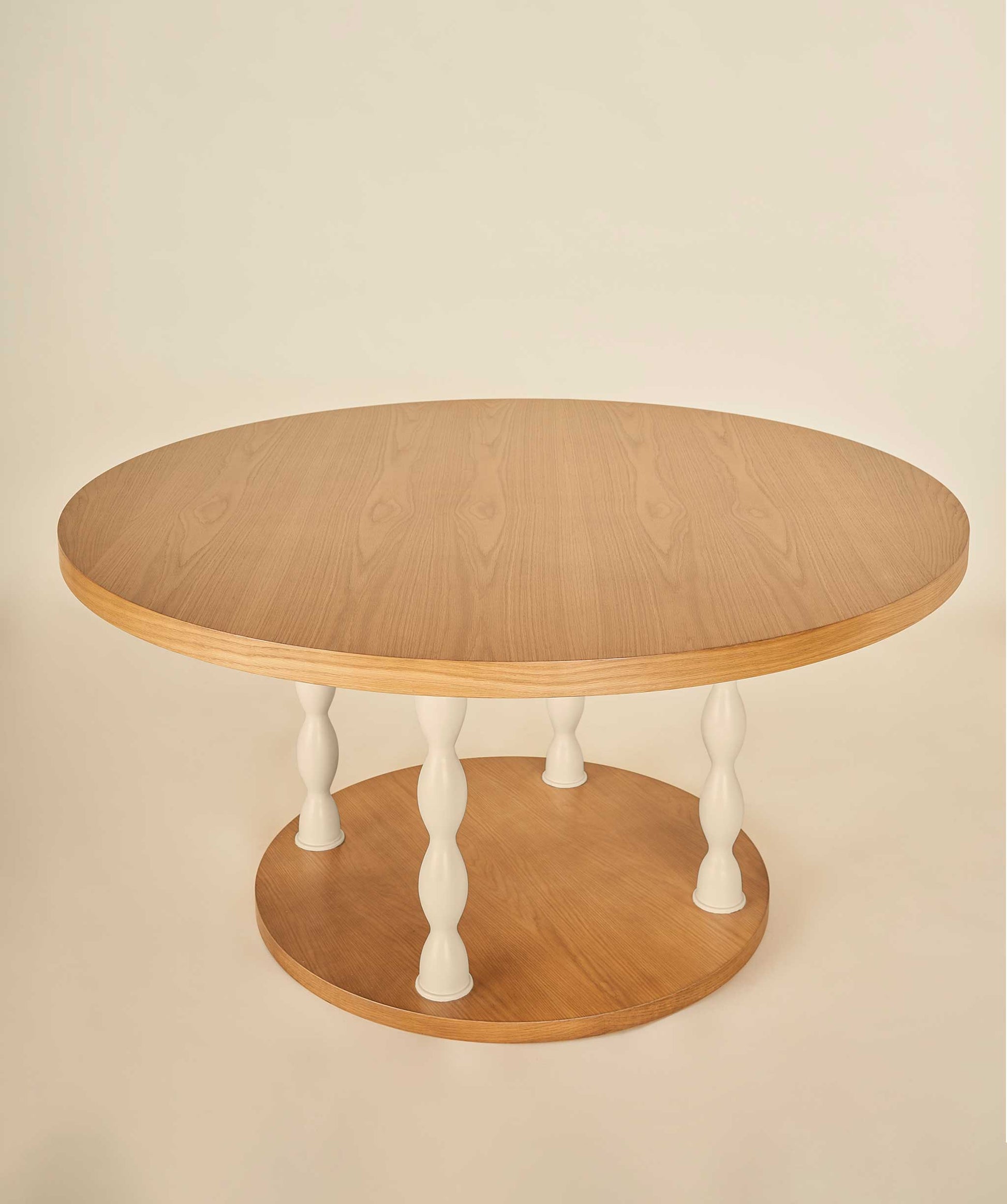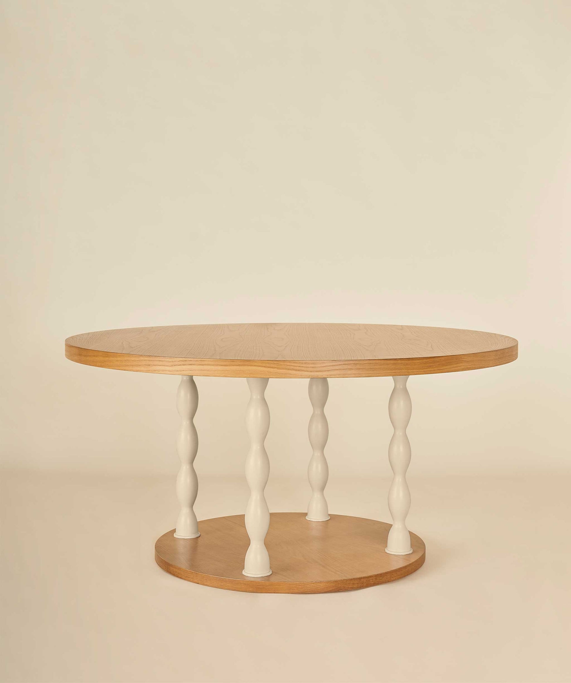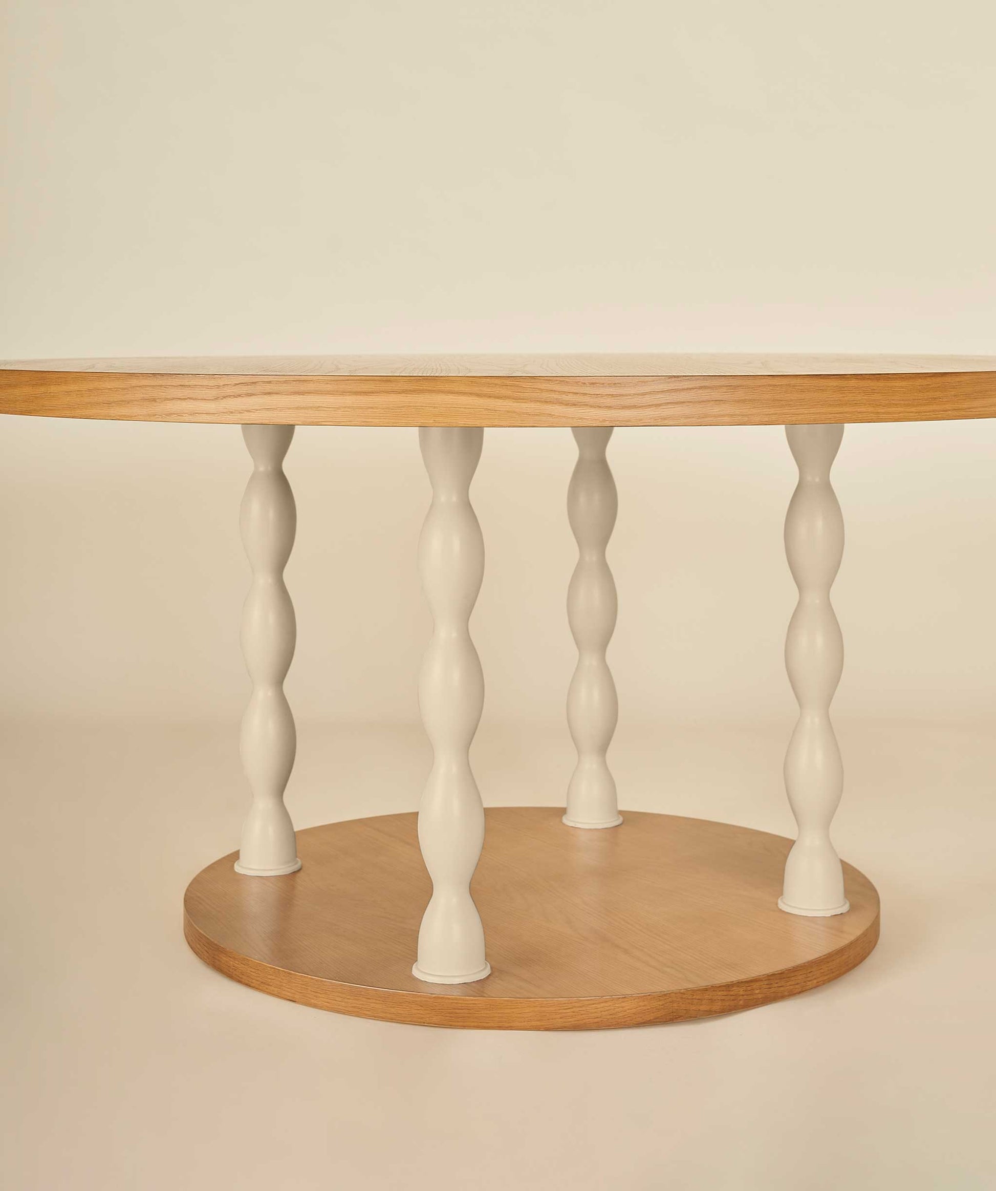 Round table in solid oak rests on four off-white lacquer legs with undulating curves and wood base.